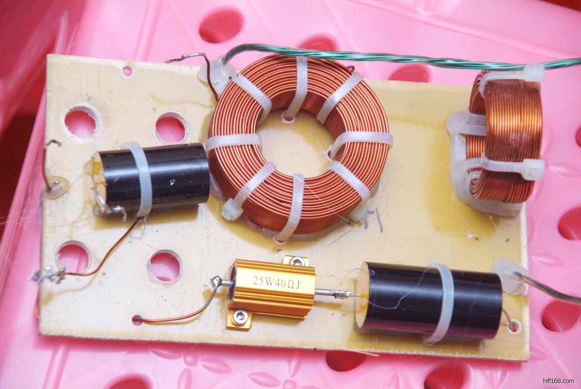各位烧兄请仔细的“瞻仰”一下这个市面上售价2.8W的名牌“奥高”采用的分频器是6dB的结构装配而成的,电感和电容还是过得眼睛的,就是电阻可能逊点吧。