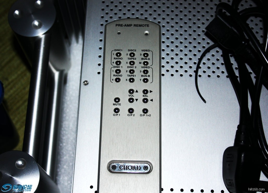 在亮麗新潮的裝潢裡,擺上一套Chord擴大機,搭配如Jadis、mbl的喇叭,一看就知道主人的品味必定不俗。這一套前後級從正面看倒不怎麼驚人,銀白色的面板,金色的旋鈕,藍色的顯示幕,外加一個鋁金屬製的厚重遙控器(可零售,定價26,000元),只覺得身材玲瓏而已。繞到旁邊一看,那像現代建築般的圓柱狀支架,背板短巧的散熱片,以及把手與機身中間的留白,簡直就像雕塑一樣漂亮。前級與後級根本就設計可疊放在一起,圓管支柱間各有三個膠墊隔離,因此不會引起共振等問題。Chord近年來延聘許多專家參與團隊,包括Dynaudio Acoustics的設計者Andy Munro等,相信這麼有創意的機箱也是出自某位藝術家之手。