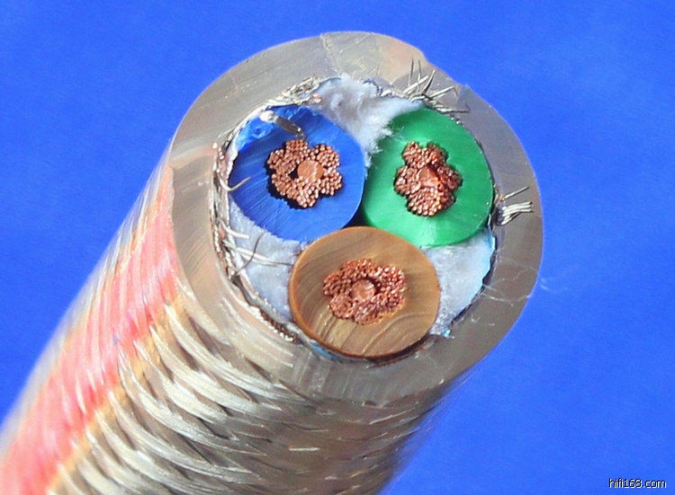 所以经过近半年的学习和考察,最终选择了联盟音响代理的台湾KS音响总线。由图中可以看出KS线的结构是以电缆的形式出现的,最外面是两层的外护套,外护套下面是一层屏蔽层,里面有三根6平方的芯线组成,如果使用环境不是太恶劣,是完全不需要另外再加套管的,施工相对难度降低很多。