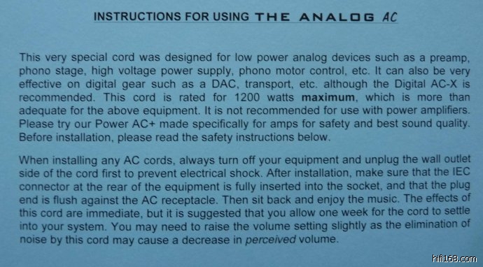 感谢购买ANALOGAC电源线。这根线对模拟设备而言具有升级的作用。他能够通过消除电磁干扰、杂讯以明显提升低电平的解析力。整条电源线的过滤效应让微动态变得流畅。因此空气感与解析力得到最大释放。最终使得音乐更具乐感。