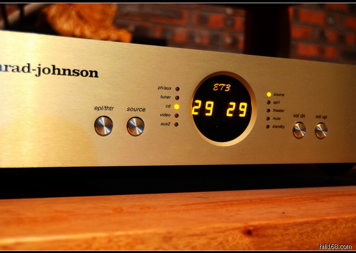 Conrad Johnson ET3电子管前级放大器 说完这么多优秀史,接着说一下产品本次测评的产品。从外形上,ET3典雅大气,雍容华贵,并采用香槟金色铝制拉丝前而板与中规中矩的机身设计,这种审美明显归属于80年代的贵族气质,但同时也迎合今天的“土豪金”特点。在前面板左上角“conrad-johnson”的丝印字体清晰醒目且富于视觉吸引力。而中央的圆形显示窗,2组2位嫩绿色的七段数字显示管显示了与两个声道相对应的前级模拟输出信号电平数值。圆形显示窗左侧设有5个竖向排列的嫩绿圆形LED发光二极管,可显示当前所选定的信号源;圆形显示窗右侧也设有5个竖向排列的嫩绿色圆形LED发光二极管,可显示着当前的工作状态。以圆形显示窗为中心,前而板左下方的电源开关、工作状态轮选按钮和信号源选择按钮,与前面板右下方的静音按钮、音量提升按钮和音量减降按钮呈对称分布。这6个略带金赤色泽的圆形操作按钮有着适当的面积,满足“指面”点按的需要,且操作舒适,给人得心应手。当然ET3还具备遥控器。