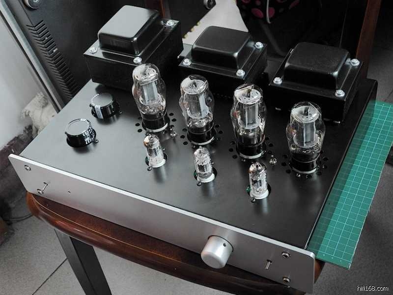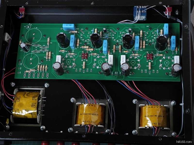 印板上的阻容器件焊接完毕之后,可以参照线路图认真核查一遍以防有误,借此机会亦分析一下整机的电路特点∶整机共采用了七只电子管(12Au7X3、6P3PX4),其中第一级电压放大级两声道共用一只双三极管12AU7,第二级的V2(V3)亦采用了12AU7来作长尾式倒相,具体来说V2(V3)的上端为激励管,下端为倒相管,此电路的特点是V1电压放大管的屏极与V2管上端的栅极直接耦合,从而构成长拖尾形式,因此输出信号具有相移失真小与频响范围宽的特点。V2(V3)管上端为共阴极形式,信号放大之后由屏极输出;V2(V3)下端则为共栅极方式,信号经阴极直耦输入,再由屏极输出,由于倒相级阴极加有较深的电流负反馈,故稳定性较好。
