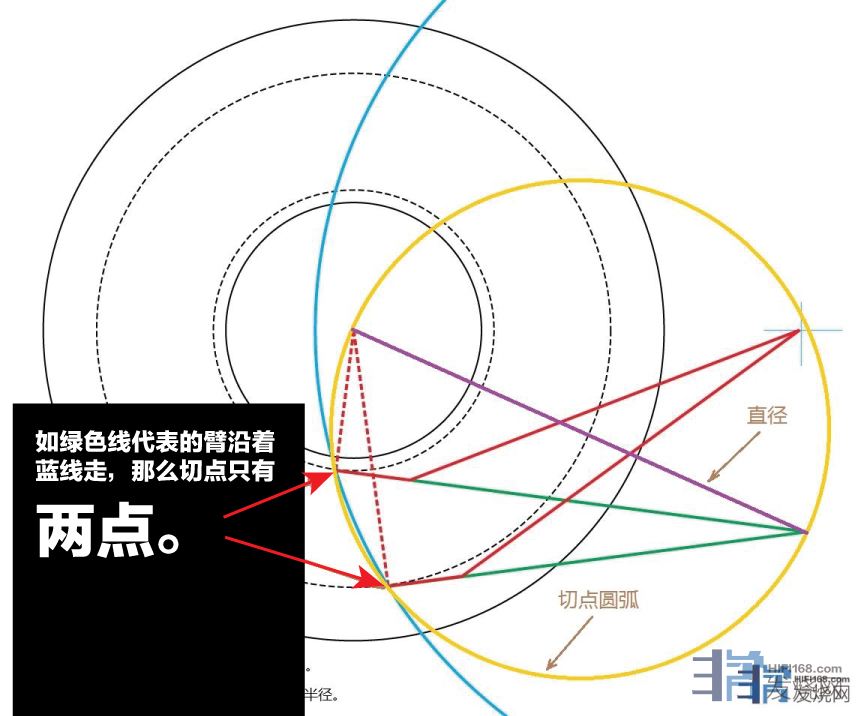 又在胡说八道了。就是在你前面那个鸟图中也有两点,怎么这里说没有直正的切点。在这图中也清楚地表明了,在超距的状态下存在两个切点。黄线和蓝色线相交的两点。如针沿着黄线走,它满足泰勒斯定理。如绿色线代表的 redsox 发表于 2017/10/29 1:40:09