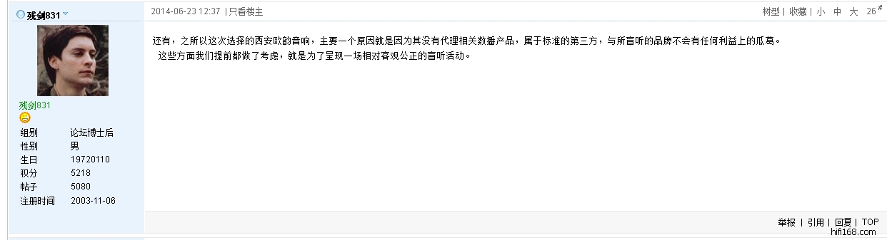 原帖由 soundaware 于 2014-7-1 11:11:00 发表享声音响支持了许多的公平对比活动,这是享声群群友在上班时发给我个人的信息,看信息上看,你的回答明显是回答购买的播放器用户,如果是音箱,只是理解上的区别,不存在道歉,我会收回之前的话语,理解由群友自断。而你昨天私下说本人信口开河,那才是错误之处。