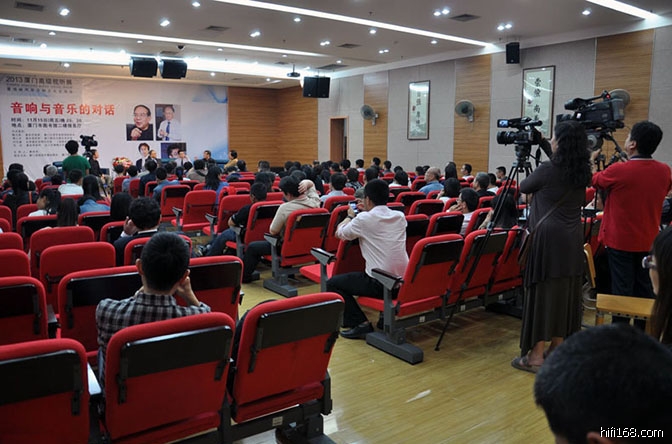 今天,我不知道你们怎么安排的。非常巧,第一工序(指自己),第二工序(指着傅人长)第三工序(刘达)第四工序(刘汉盛),(笑声)当然最后是给大家服务的。这个,就那么几个工序嘛,音乐就是创作演...这还缺个演奏员,哈哈,他就全代替了(指着傅人长)。音乐实际上它是纯三要素嘛就是创作,二位创作演奏然后欣赏。现在欣赏不仅仅是坐在音乐厅里面,我可以这么说,包括我在内,一个专业音乐家在内,我百分之九十的时间就是我接受音乐的状态,还是通过器材,而不是在音乐厅里。没有那么多的时间、机会去欣赏尤其你想听好的乐团演奏你想要的曲目的时候,你除了听唱片你没有别的渠道。比如,我今天想听芝加哥乐团演奏的这个《漂泊的荷兰人》,你们过来演吧。那不可能吧(笑声),把唱片打开。所以我到现在觉得“音乐与音响”这个题目,越来越变成一个大众的题目。