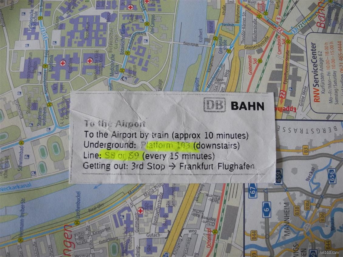 这是从法兰克福火车站去法兰克福机场时车站的Information给的指路条,非常清楚,细致,完整。