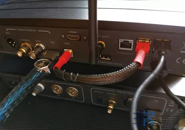 打开欧博RDS1转盘可以看到由三个部分组成:华硕Tinker组成的数播核心板连接4个USB 2.0的A型接口;Xmos USB界面则有1 个USB B型接口与I2S输出,另外就是大面积的锂电池供电模组。好了,我们转到背面看看RDS1背面众多的USB接口。右边4个USB 2.0的A型接口,其中2个可以正常的连接光驱、U盘。USB接口下方有个集线器输入(HUB Input),原厂附了一条短的USB线,当使用背板中间Hard Drive硬盘专用USB 2.0接口时供电是不够的,就必须把HUB与其中1 个USB连接上以提供足够的电力。另外1个USB接口与背板中间的B型USB接口连接,也就是把分离的USB界面板与核心板之间连接起来,原厂附赠一条红色纯银USB线。RDS1由于核心板和USB界面分开,带来了多种玩法。拔掉红色的USB线,Tinker核心板可以通过4个USB A型接,搭配其他品牌解码器;也可以将电脑或其它数播转盘插在USB B型接口上使用。