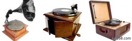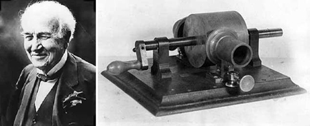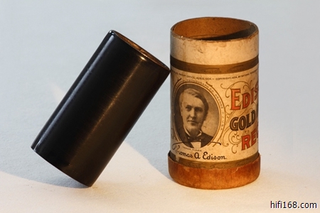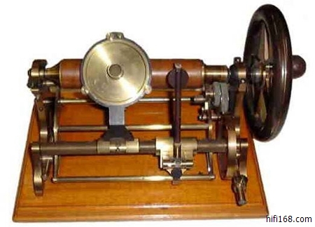 1877年 爱迪生发明的第一台留声机,可以将声波变换成金属针的震动,将波形刻录在圆筒形腊管的锡箔上。当针再一次沿着刻录的轨迹行进时,便可以重新发出留下的声音。1900年,爱迪生将第一代留声机的话筒上,加了一个喇叭形的音筒,作为扩音器用;用蜡筒代替锡箔,这样蜡筒可以重复使用;机箱里装上了驱动结构,每次只要上紧发条,就可以自动录放。