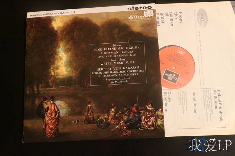 5607,莫扎特《G大调弦乐小夜曲》、《3首德国舞曲》,韩德尔《水上音乐》,卡拉扬指挥柏林爱乐乐团、爱乐乐团。EMI/Columbia英国邮票音符第三版,NM,260