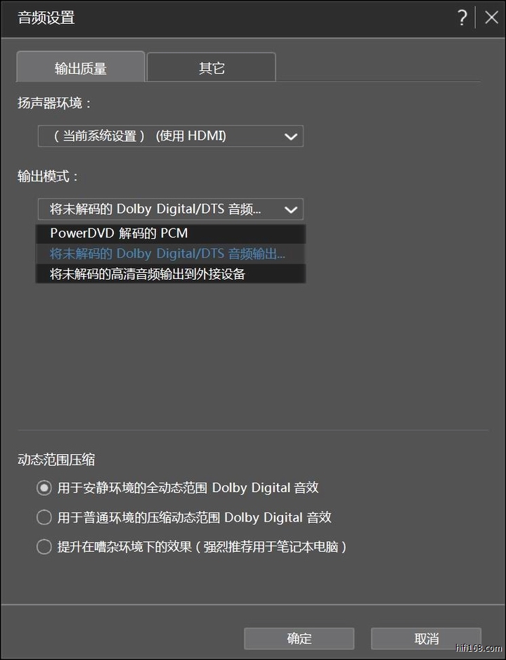 2. 计算机HDMI输出模式,可以使用Windows支持的所有音频、视频播放形式,根据播放软件可以相应调整其设置,例如 CyberLink PowerDVD 15 播放蓝光音乐,HDMI有三种输出模式可选,如下图: