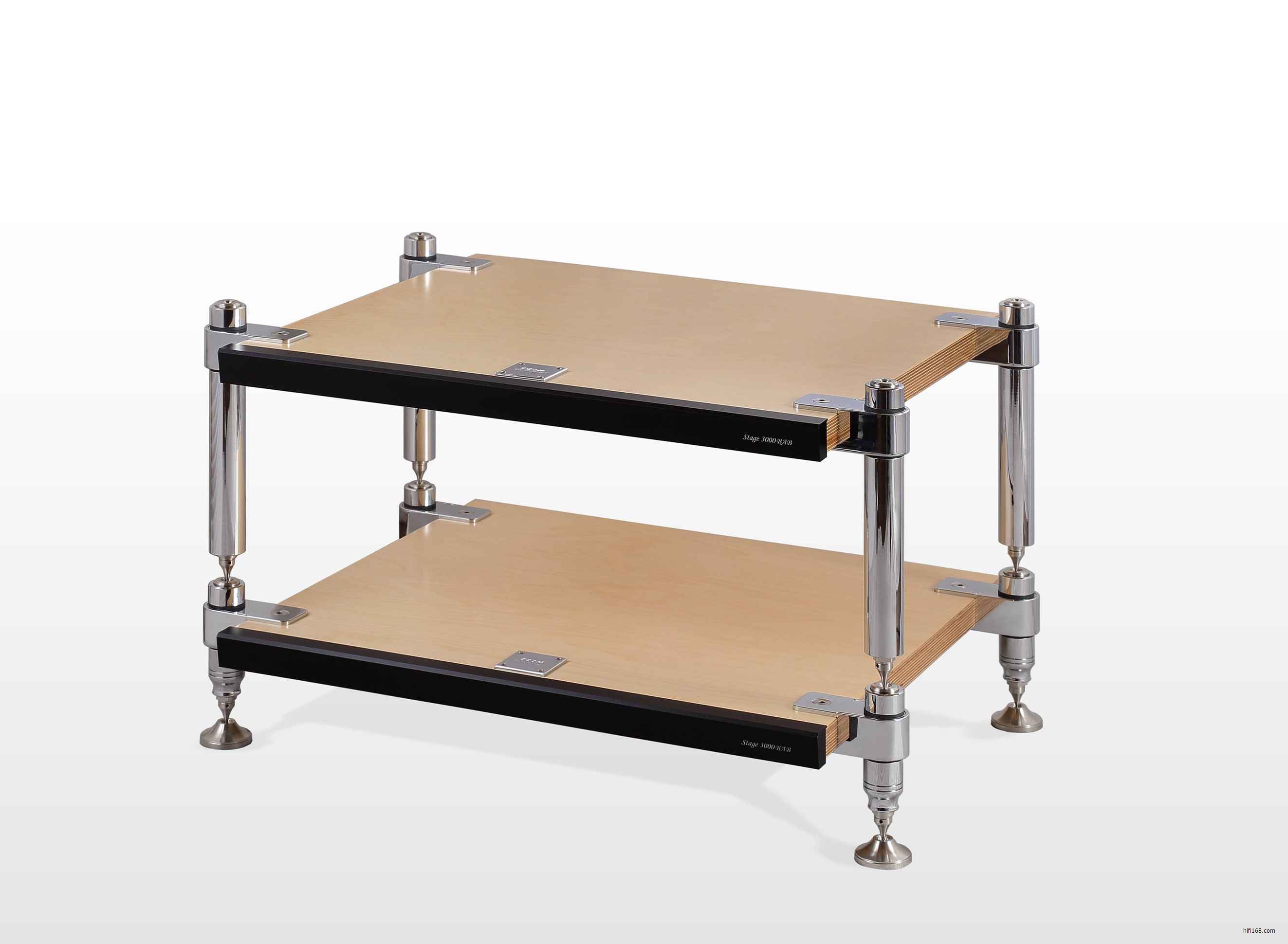 而我们现在迎进到国内的是Stage 3000BAB,这是该品牌最顶级的型号。每一层的立柱独立分开,用户可以随意搭配。立柱有黑色和镀锣两种选择,而层板的颜色有桦木本色,黑胡桃,纯黑三种。