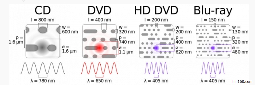 下图就是相同面积上几种碟片格式能够记录的信息密度(高倍放大示意图)。