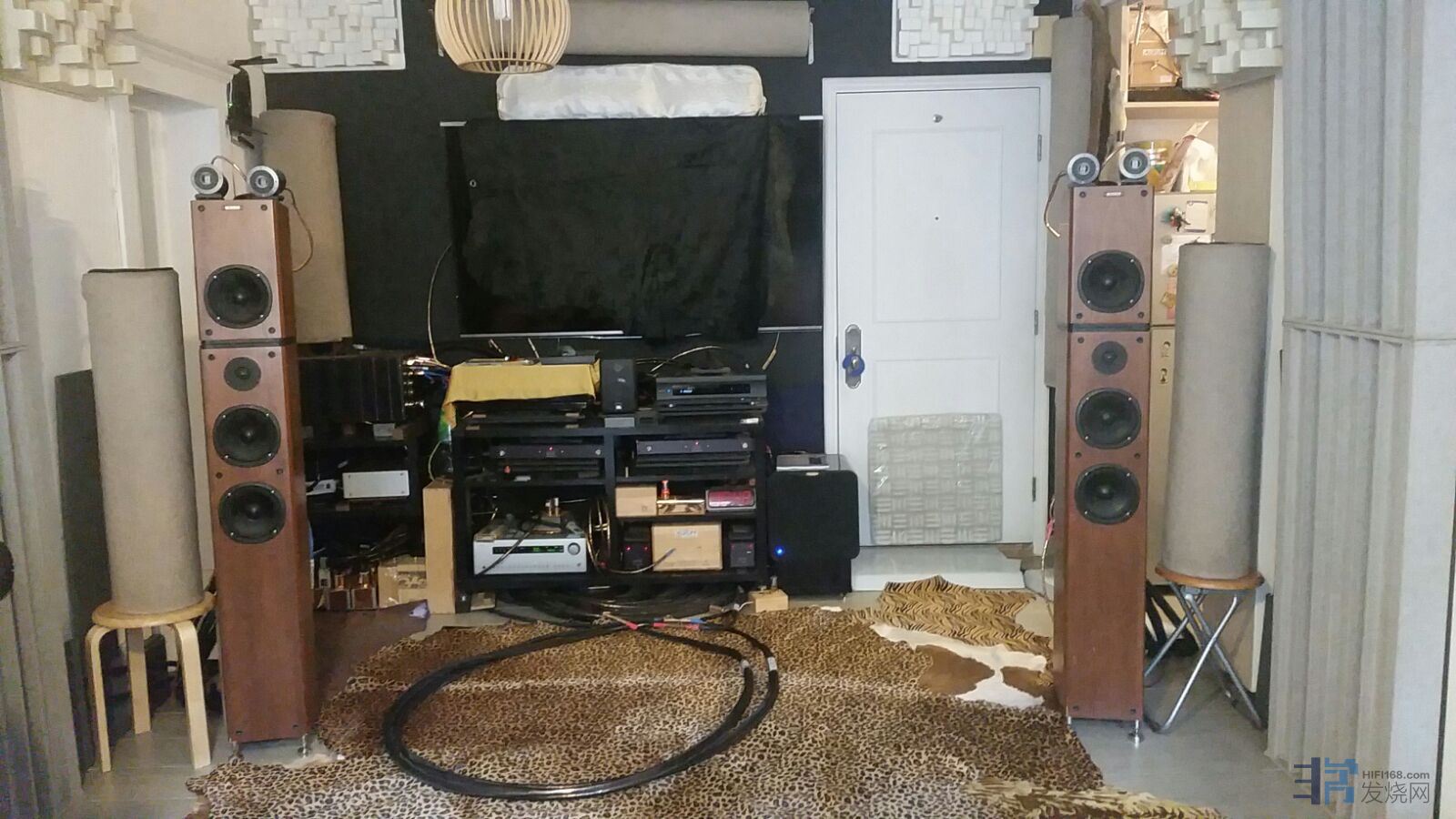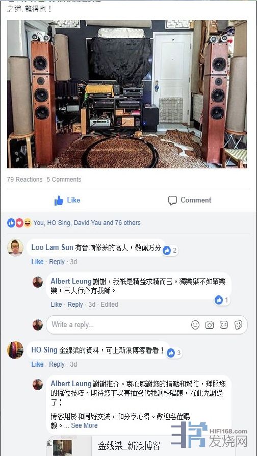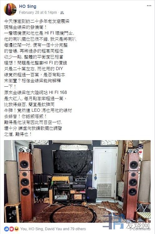 一看环境便知他也是 HI FI 环境斗士,他的喇叭摆位已很不错,我只是将喇叭每边拉阔一吋,便有一个十分完整的音场,再将过多的超高同超低收少一点,整体的平衡度已相当理想!