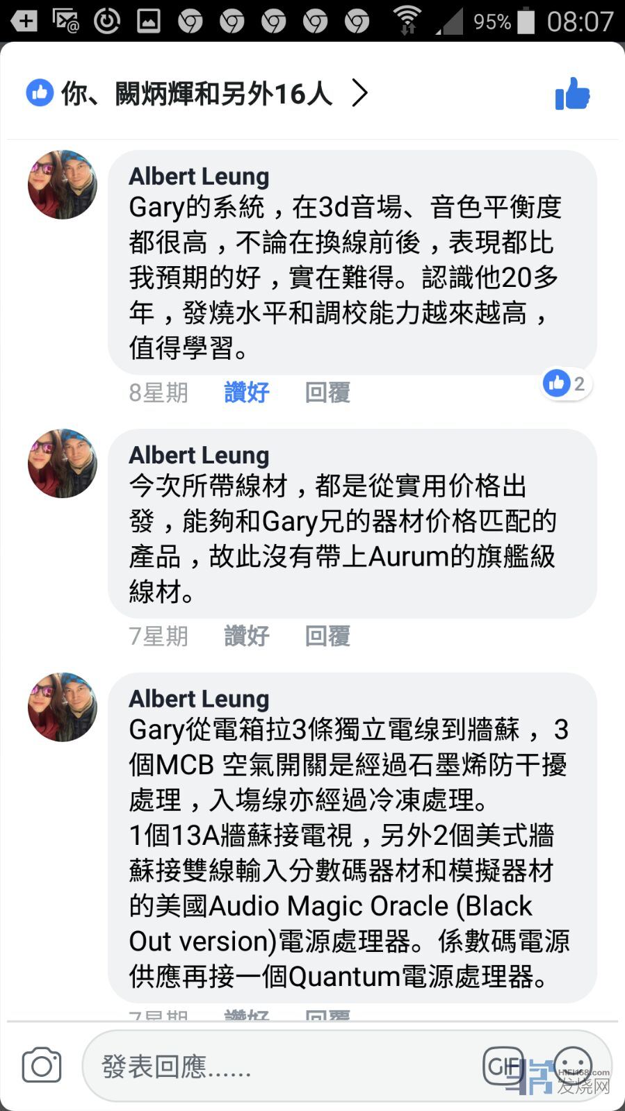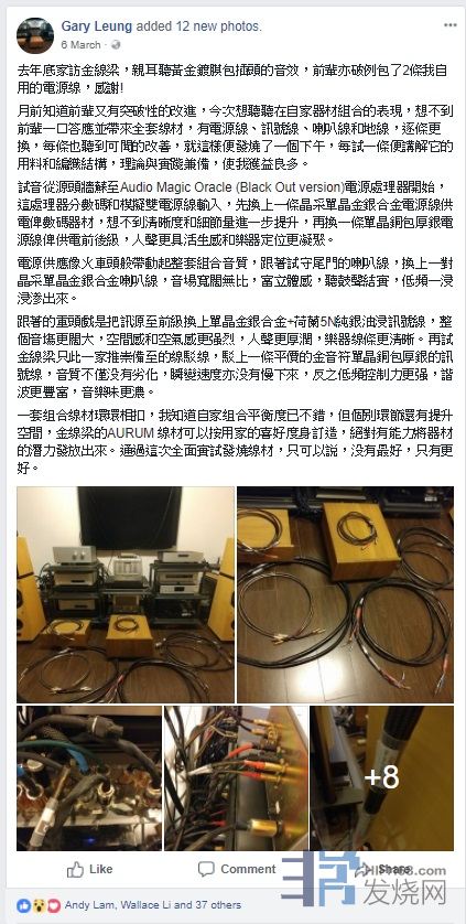 Albert Leung Gary的系统,在3d音场、音色平衡度都很高,不论在换线前后,表现都比我预期的好,实在难得。认识他20多年,发烧水平和调校能力越来越高,值得学习。