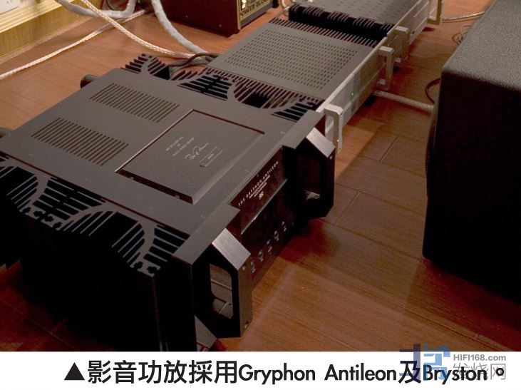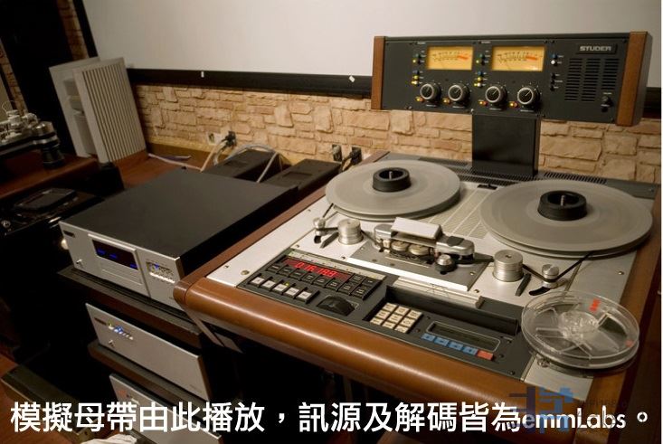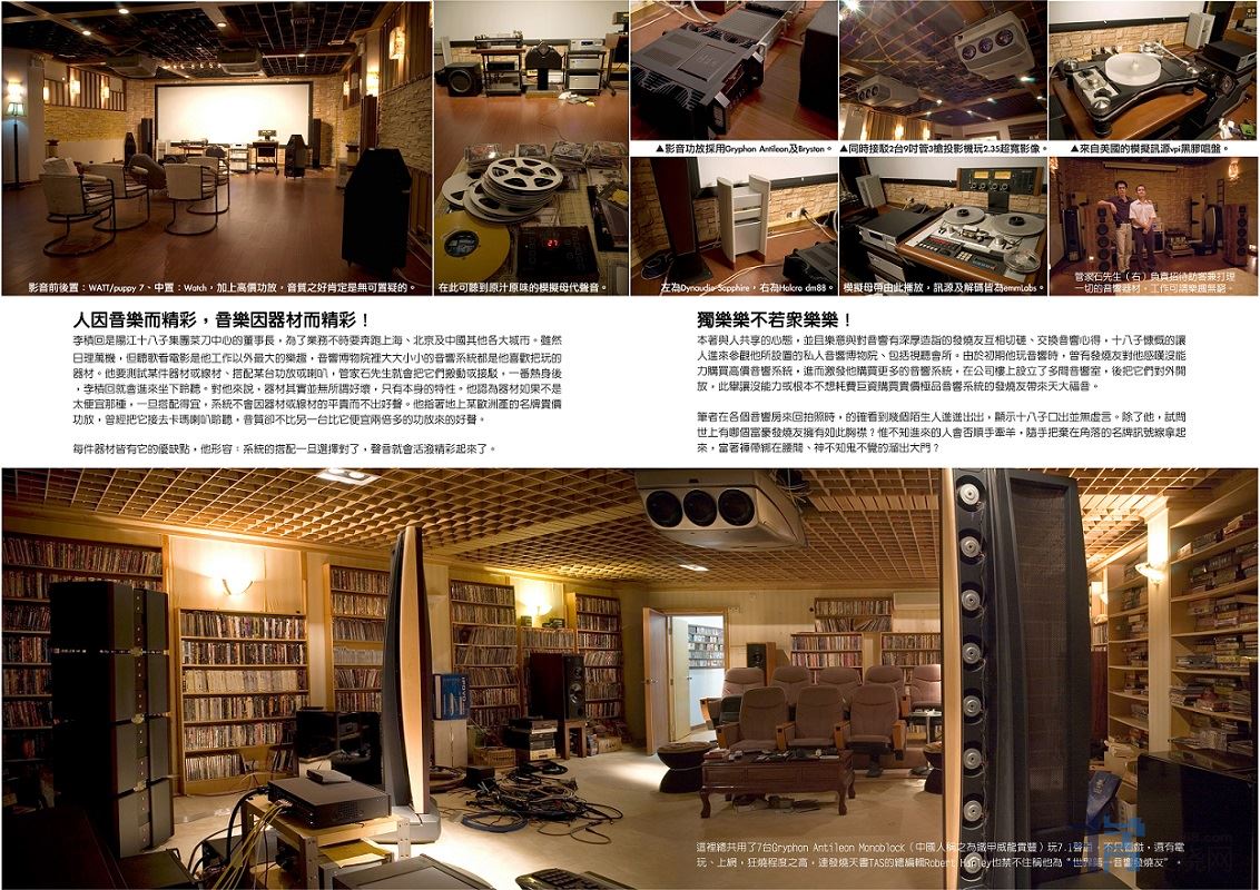 再进去里面的大房,这里更夸张,吊着两台Sony顶级的9吋管投影机、2.40超宽屏幕、4只WATT/Puppy做前后声道, 中置是同一家族的Watch。前关讯源一律采用emm Labs:转盘、6e数码转换、6声道DSD解碼及自家的Switchman6声 道前级,黑胶转盘则有vpi。除此之外,地上还有多台不同的功放:Bryston、Halcro dm88及Gryphon Antileon Monoblock,屏幕旁还有一对来自丹麦的Dynaudio Sapphire 35周年记念版座地喇叭。这间房引起我注意的其实并 不是以上的器材,而是那台播放母带的Studer!笔者没有坐下聆听,因为还有楼上两层未参观。
