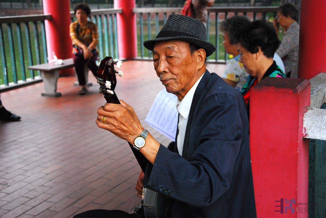 广东音乐民间演奏班子又称之为“私伙局”,由主要的五件乐器如高胡、椰胡、扬琴、秦琴等组成而称之为“五架头”,一般来说地道的“五架头”演奏水准都是很高的,如广东音乐的高胡演奏名家余其伟便是“私伙局”出身。今天在越秀公园看见的这些老人操琴演奏只是为演唱粤剧伴奏,属自娱自乐的消遣而已,但也是一道风景。