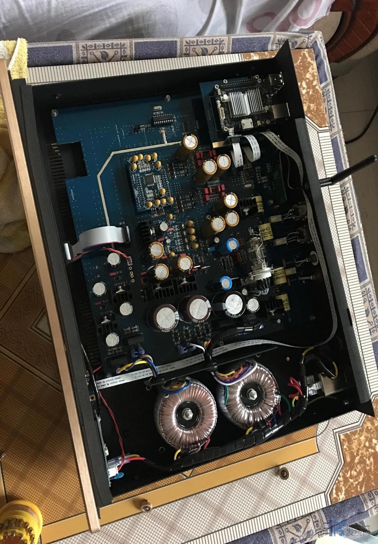 继续学习传图。欧博R8P金色机壳配上胡桃木,显得富丽而又大气。配有一个苹果遥控器,一本说明书,一根电源线。