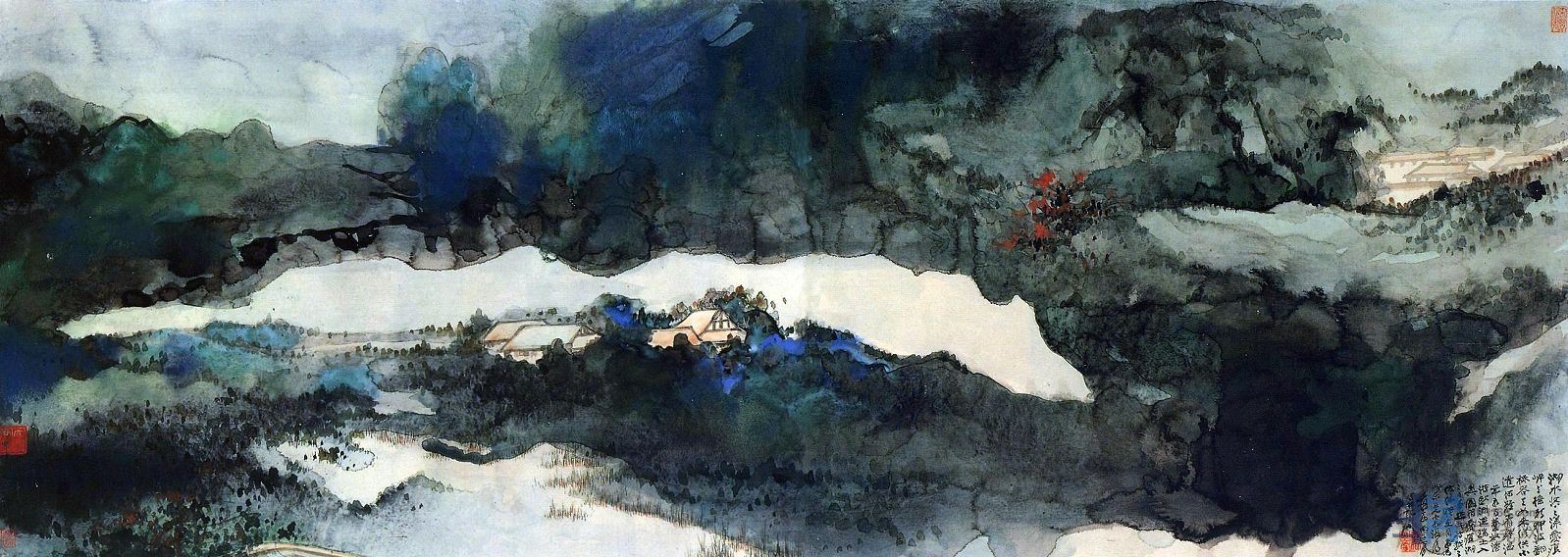 尤其是张大千,他的泼彩山水,其中对青绿中国画颜料的运用,炉火纯青,可见深受王希孟影响。