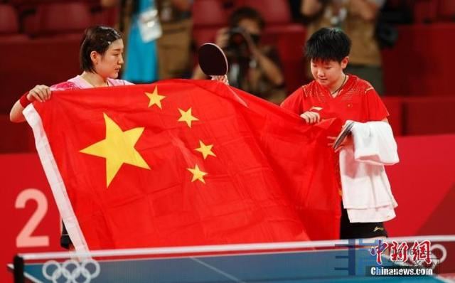 莎莎也非常坦然、豁达,与陈梦一起举起国旗。莎莎才20岁啊,青春无敌。