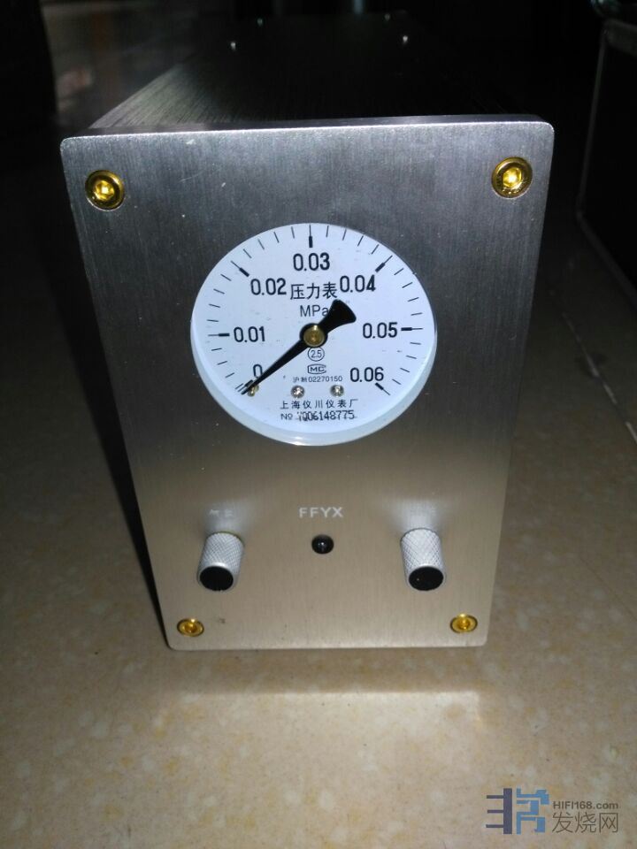 大家别以为要驱动60mm厚铝合金唱盘和唱臂的气泵很大很重甚至很嘈,事实却令人极为意外,FFYX配套的气泵大小和EAR834P唱放相若,而且工作时寂静无声,即使摆放在音响架旁边也丝毫不会产生任何的噪音。你知道吗?日本TechDAS的Air force的气泵如同一台大功率后级,而美国Walker Proscenium的唱盘更需要采用5个外置气泵,体积加起来相当于一只12吋低音的中型落地箱了,而且工作时的噪音可不小,必须要把气泵安置在聆听空间外,还最好做个密封的箱子把它们隔离起来。FFYX的气泵实在小得太可爱了,面板还带有气压表,可实时了解工作状况。气泵通过自压式接头安置输气软管,只需简单地将两根气管和唱臂及唱盘连接上,插上电源就能正常使用了。通过FFYX,大大改变了我对气浮唱盘难伺候的印象。