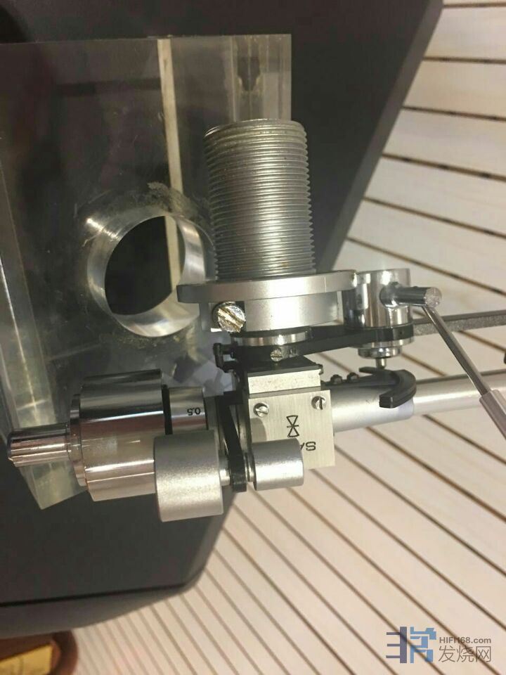唱臂上这两颗金色的螺丝就是用来调整唱头参数的,稍松开就能前后移动唱臂至合适的位置,确保准确的循迹角度。旋转唱臂还可调整垂直循迹角