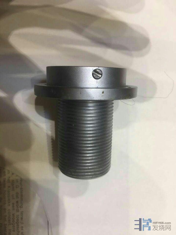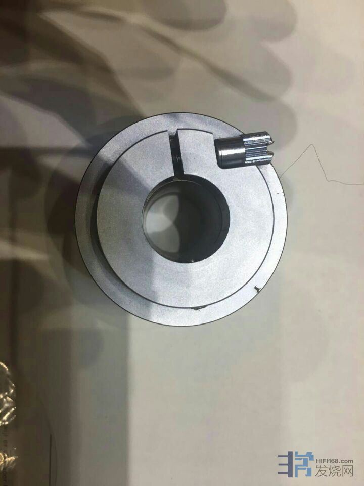 其余细节设计方面,10周年MKⅡ也是毫不妥协,比如唱臂轨的设计,蒋先生采用成熟的圆管“导轨”方案,唱臂套在“导轨”圆管上,圆管的上方直线分布着数个微小的气孔,气流通过气孔喷出浮起唱臂,令唱盘套和“导轨”之间形成均匀的气膜,杜绝任何机械接触,从而获得无阻力的顺畅循迹性能。对于灵敏度极高的气浮唱臂,唯一的阻力或许是来自于唱臂线,FFYX采用36号(不确定)的纯银线,线身极细之余还相当柔软,目前我还未曾在同级唱盘中见到过这么高素质的唱臂线。蒋先生的用心与考究在这个细节上令人称道。信号输出接口的方式依然采用一对美国CMC镀金RCA座,方便玩家更好常规信号线来调声搭配。而外置的驱动马达和上次试听的T4相同,摆放在转盘旁边,注意前后的位置,我建议前端平齐摆放,才不会干涉传动皮带的运转,也不影响调速旋钮的操作。遗憾之处,FFYX没有内置转速监测功能,需要用测速碟来完成转速的精确调整。或许我被Amari的丰富功能宠坏了,我觉得唱盘能数显实时转速是很方便实用的设计。