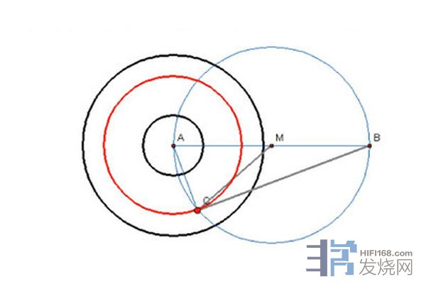 Thales唱臂的工作原理:右边黑圆是黑胶唱片,M是唱臂的支轴,CM就是唱臂,只要让唱头对着CB方向转动,不论在蓝色圆上哪一点都是垂直的。