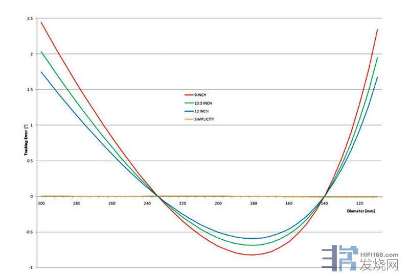 固定支轴唱臂的循迹误差,9吋(红色),10.5吋(绿色),12吋(蓝色),Simplicity则是黄色,可以看出一般的单点支撑臂只有两点的循迹误差是零,而Simplicity则是贴在零点那条线上,误差只有0.008度。