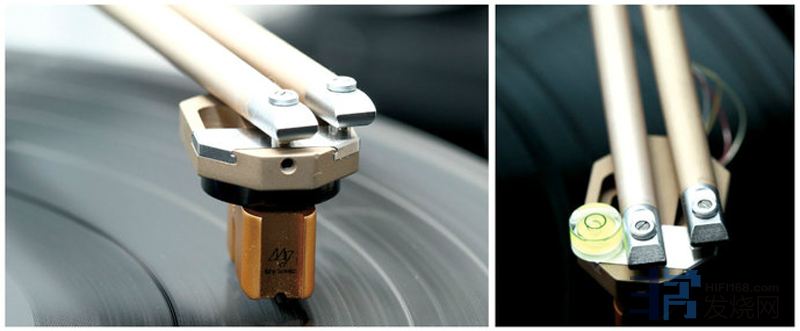 左:唱头壳也是采用阳极处理过的铝合金制作,与唱臂的结合是非常精密的滑轨设计,装上去之后再用小板手从中间的小洞锁住即可。