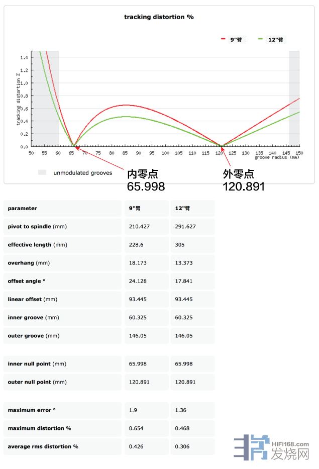从计算结果表明,9吋臂和12吋臂不管它的有效长度是不同,但其内零点和外零点的位置都是同样的。也就是说我的尺其基本原理是正确的。