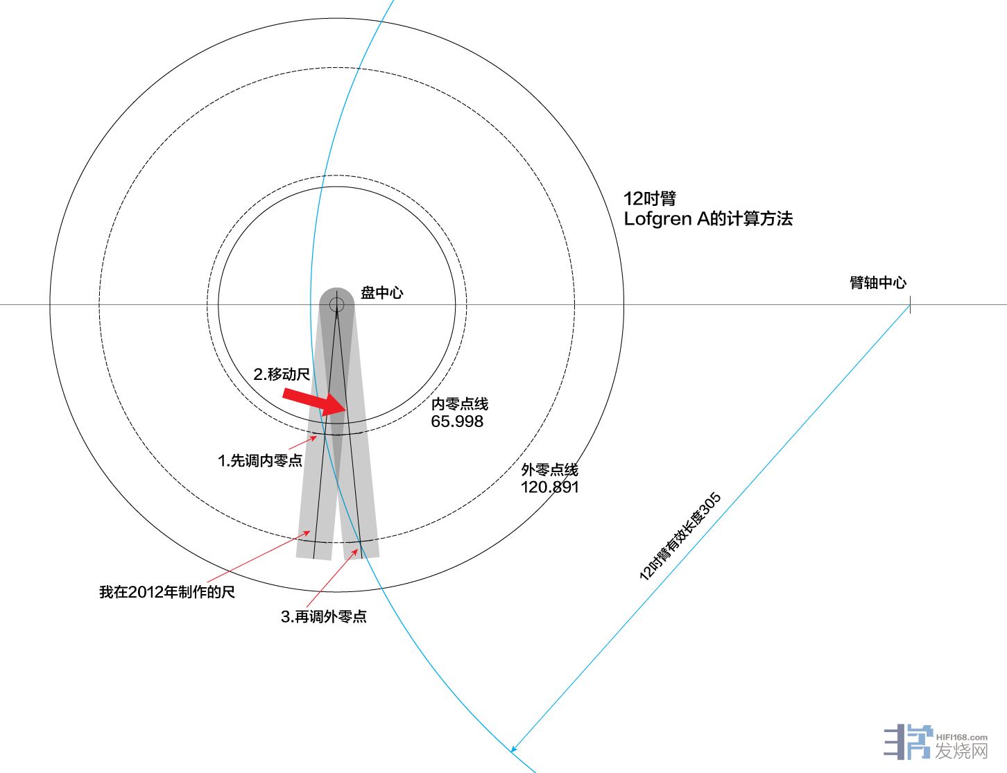 再看12吋臂,红色的圆形也与两个零点,盘中心,臂轴中心同时相交。