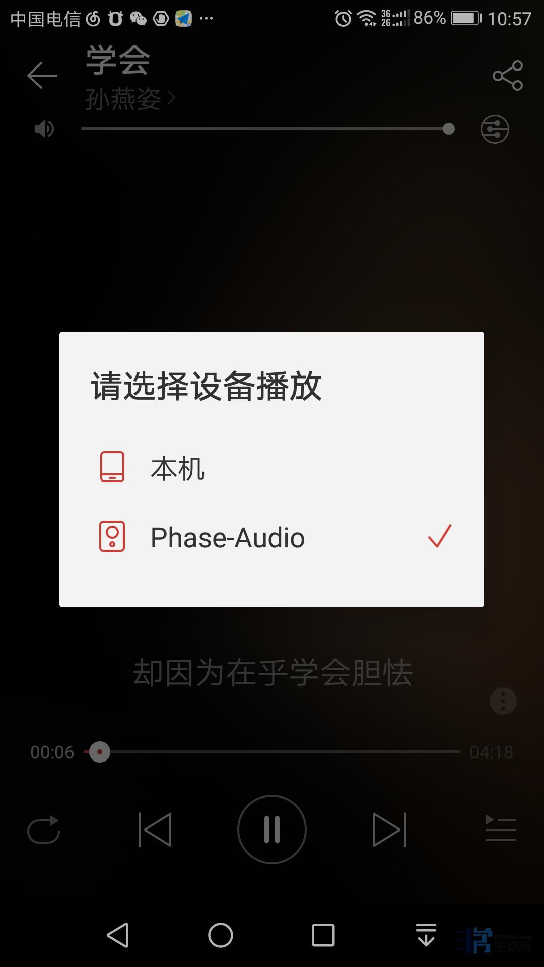 5,播放在线音乐时候,不要选择本机播放,选择Phase-Audio,就可以把信号传送到解码器中,通过家里的音响系统播放出来。