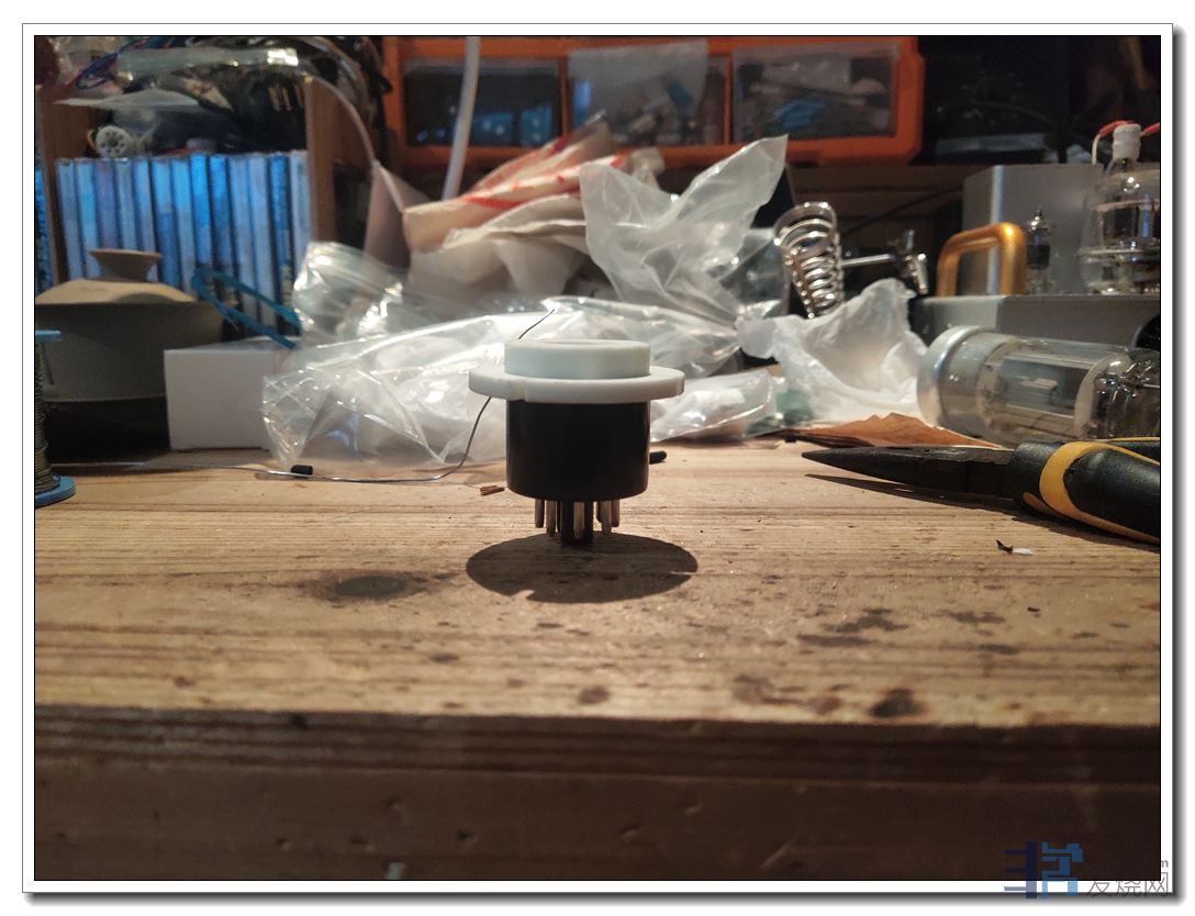 前后制作了两款,成品图上述楼层也发过了。第一款是在大8脚管座上直接用铜线加装接头,不需要使用5Z9P陶瓷管座(FU50通用)。