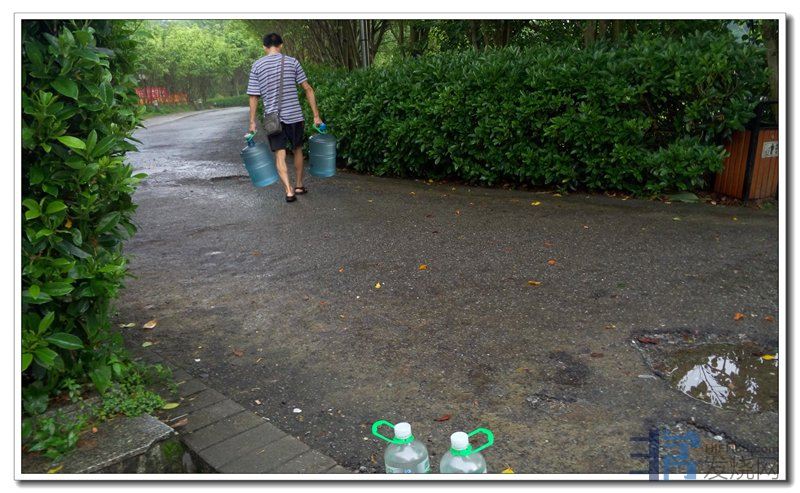 不允许开车进去的,装完水后一手一桶(约40斤一桶),挽到路口,再开车来载走。