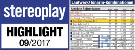 荣获德国STEREOPLAY杂志“HIGHLIGHT"奖,并在杂志2017年度世界黑胶唱机总评比中位居 最顶级黑胶排列 第四位。