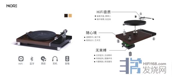 MORE 专业级黑胶唱机,具有认真专注的特质。出色的HIFI级碳纤维唱臂拾音精准,通过科学精密计算,循迹误差低于0.7%;磁悬浮转盘实现径向“零”摩擦,抗谐振,1000g纯金属唱盘,保证转速极稳。同时,MORE 还支持蓝牙耳机/音响,蓝牙4.0 APT-X与有线连接音质基本无差。更有英国CSR 8670蓝牙发射芯片,音箱耳放随心连接,无限享受。专利避震脚钉实现水平垂直双向避震,MCU微电脑控速可实时智能闭环控速,转速精准。高端科技搭配纯天然橡木皮,腔调随音乐的韵律流淌开来。
