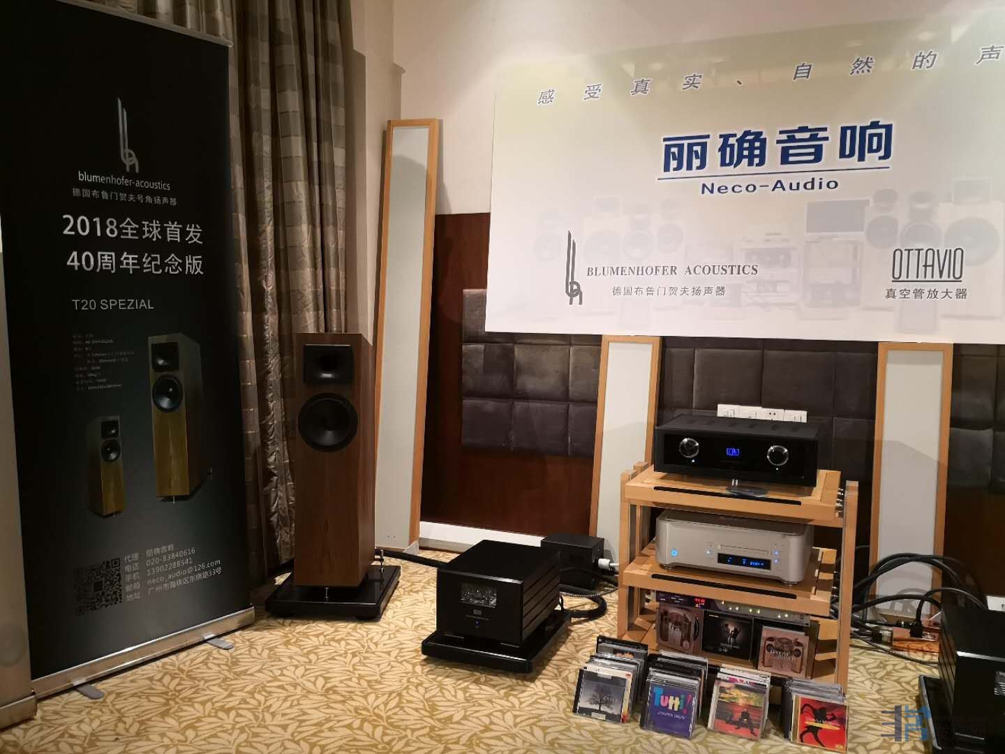 今年丽确展示的音箱是全球首发的布鲁门贺夫T20 SPEZIAL 40周年纪念版8寸号角落地箱,较之前几届音展上丽确的搭配,这款音箱无论是在布鲁门贺夫自家档次分级中还是其定价档次方面都是算入门级的小僧。按理来说与更高级别大僧正相比应该会有明显道行上的差距。但实际表现远非如此!在丽确新调教的前后级驱动下,T20的声音质感非常清明致密,同时保持着高级胆机应有的适度的柔润度和不错的空气感。全频呈现出优秀的流畅连贯性,前端给予音箱的驱动力非常充分,从声音判断可以说做到了对T20的各方面特质得完全掌控和挖掘。无论是大编制的交响乐作品还是简单配器的人声作品,这套系统都应对的非常从容自然,最关键的一点:这套系统保持住了布鲁门贺夫最珍贵的声音品质:理性的肌底鲜活的心!就这一点而言,丽确这套胆前后级与布鲁门贺夫是非常搭调的。