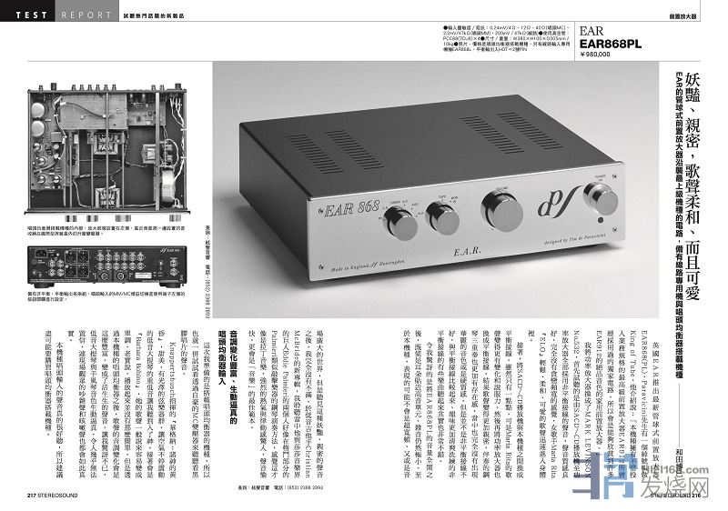 英国EAR推出管球式前置放大器EAR868 (PL),Paravicini先生有一个绰号叫做King of Tube,他介绍说:【本机种拥有不惜投入业务规格的最高级前置放大器EAR 912所曾经采用过的独家电路,所以会是能够欣赏到许多EAR 912的绝品音色的家用前置放大器】。