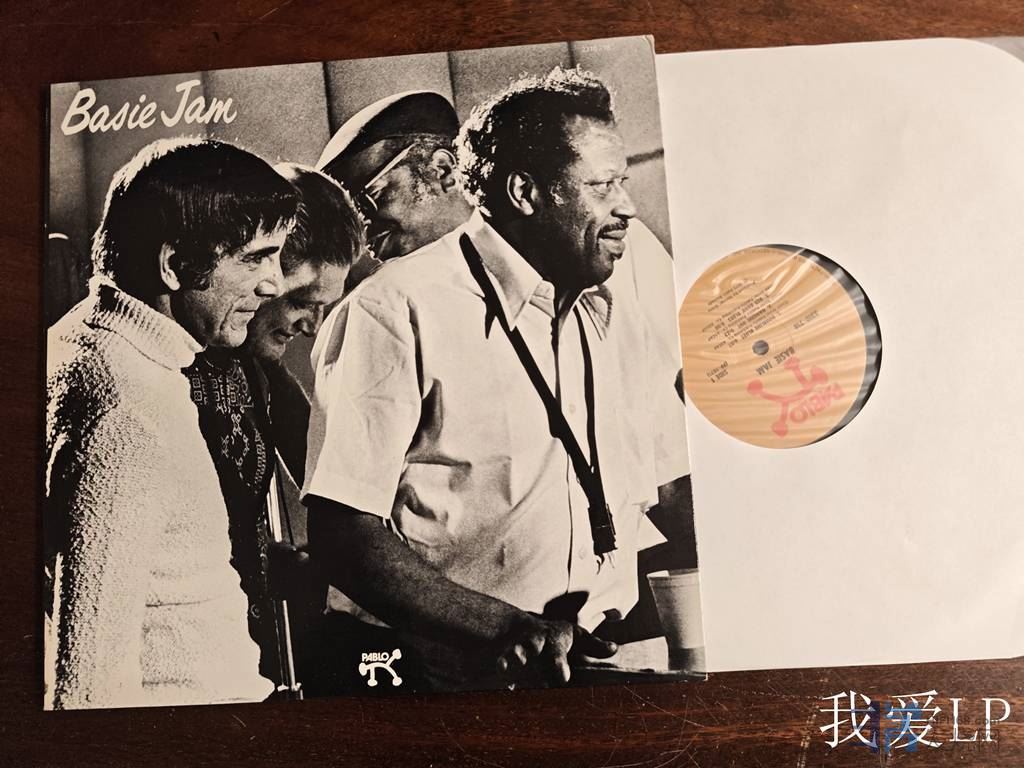11115,爵士名盘《Basie Jam》,西贝伯爵联合雷.布朗(贝斯)、贝尔森(鼓手)、J.J约翰逊、爱迪生(小号)、埃迪.戴维斯(高音萨克斯)、西姆斯(次中音萨克斯)等众多大师1973年的录音,大师们就像一支精简了的大乐队,呈现了爵士乐最精髓的摇摆元素、无拘无束而紧密联结的节奏。Pablo美国头版,EX++/NM-(如新!仅强光下勉强可见虚弱擦痕,但A面2个针眼大的磨损点播放各有几下柔弱滴答),150