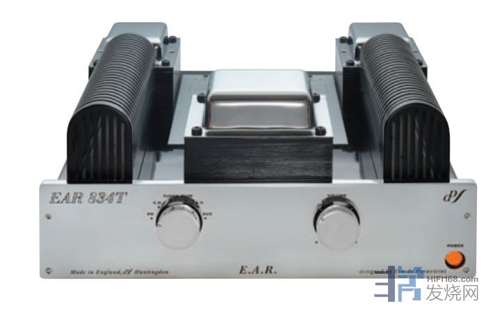 EAR以834为名的器材有834合并放大器,834P唱头放大器,834L前置放大器,都是以真空管作主动元件的。 而这部834T合并放大器,却是用晶体管的;T自然是指Transistor,晶体管。834T与834在外型上是没有分别的,用同一机箱,只是在834T机顶两旁原为保护真空管用的罩,里面并没有真空管,只作为装饰之用;而三只有银色外壳的变压器仍很抢眼地在原位闪耀,前方的电源变 压器固然不是装饰,后方的两只输出变压器却仍然是「有料」的,不是装饰品!所以我第一眼看到834T时,也误以为这是一部胆机!