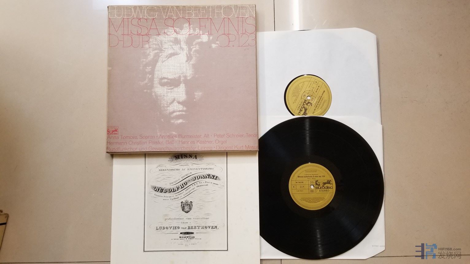 库尔特·马祖尔 指挥莱比锡格万豪斯广播合唱团,安娜·托莫瓦、安妮丝·伯迈斯特、彼得·施莱尔、赫尔曼·克里斯蒂安、汉内斯·卡特纳 演唱《贝多芬 庄严弥撒》(2LP),德国eurodisc立体声,2张唱片NM-、EX,已售