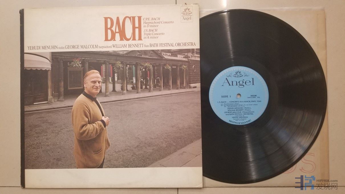 梅纽因 小提琴、马尔科姆 大键琴、本奈特 长笛、巴斯音乐节管弦乐团《CPE.巴赫 大键琴协奏曲,巴赫 三重协奏曲》,美国Angel单声道,水蓝标厚盘头版,唱片NM-,45元