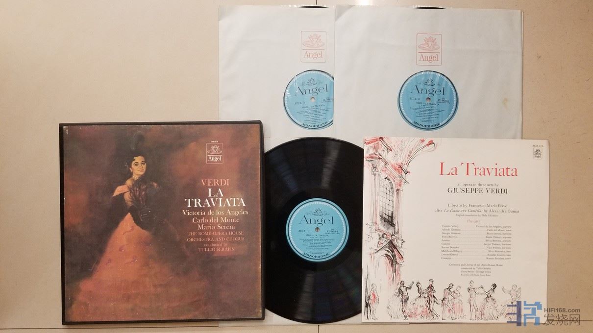 上榜歌剧名盘,塞拉芬 指挥罗马歌剧院管弦乐团及合唱团,安赫莱斯、蒙特卡洛、塞雷尼 等演唱《威尔第 茶花女》(3LP),美国Angel单声道,水蓝标厚盘,3张唱片EX,70元