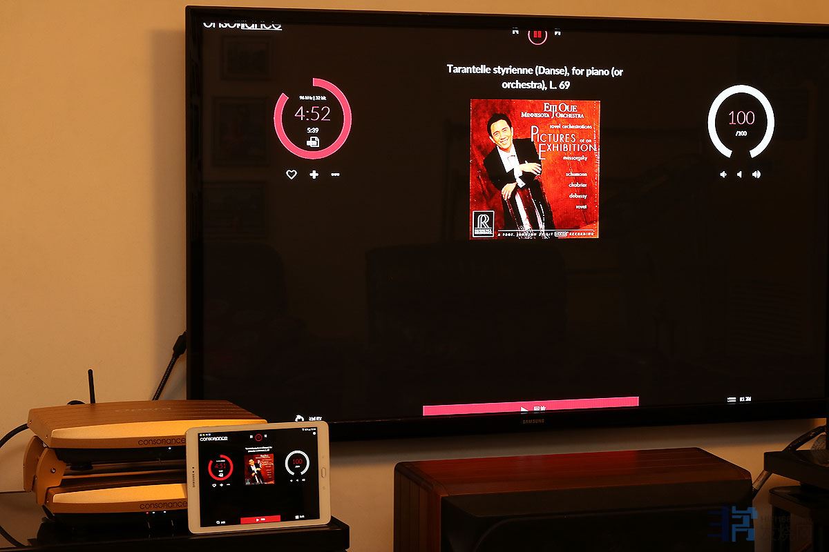 这套数播还有HDMI视频输出,接到电视或者显示器,就可以看到唱片封面、文件格式、时间等等资料。