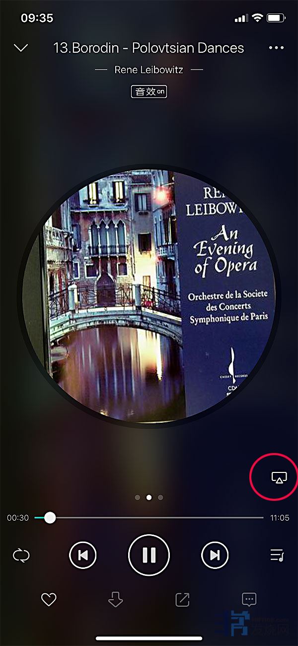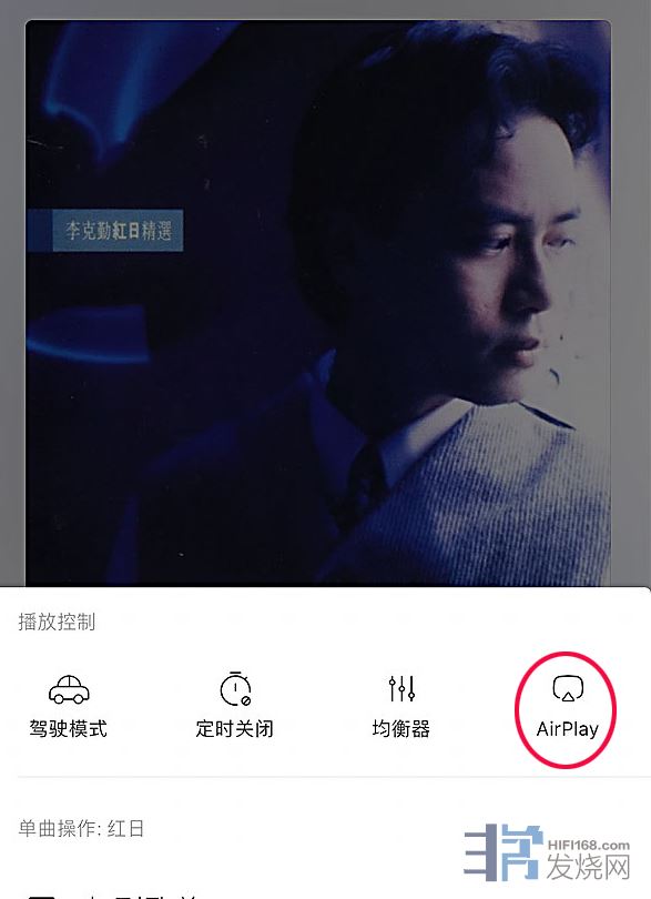 虾米音乐界面,在播放界面同样选择airplay。