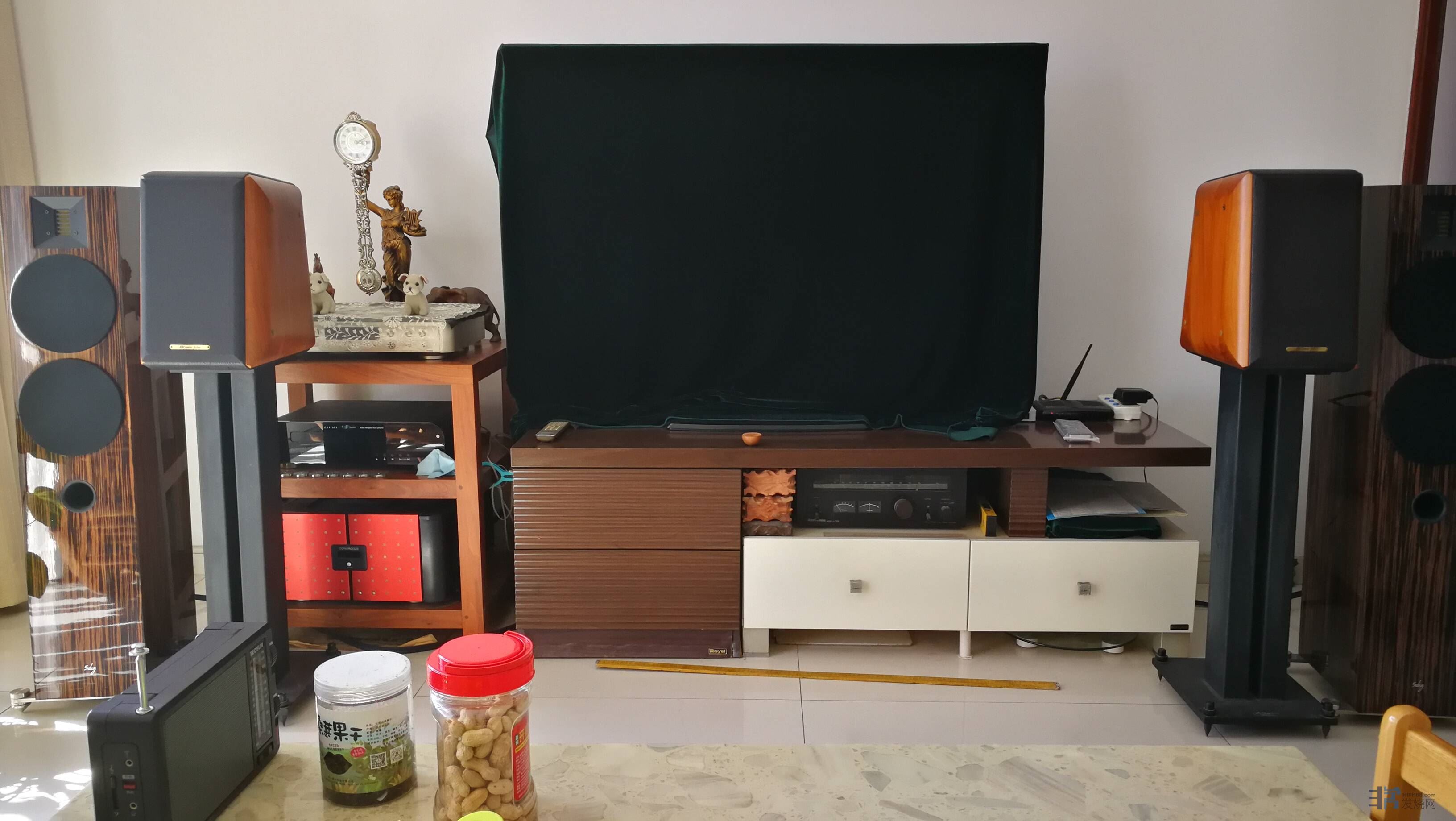 由于市道不好,我在二手出世霸中乐琴时,被一些烧友压价太多了。在试听中,无意感觉这样摆两对箱也不错,可以双修,家属也反对低价出世霸,毕竟世霸陪伴我们时间太长了。在对比人声过程中,还是感觉世霸箱有人情味多一些,我小孩的比喻是:人声,世霸箱像等离子电视,而落地豪恩箱就像液晶电视(这两种电视我家都有)。