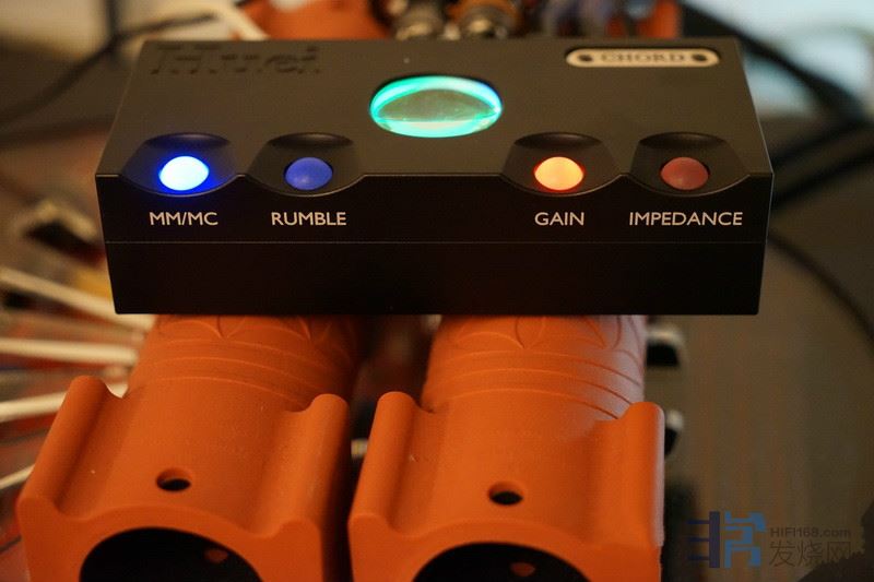 再来,我看到Huei上面有几个发出不同光线的按钮,这些按钮是多工的,以微处理器控制。第一个是MM/MC切换,第二个是Rumble,可以消除黑胶唱盘50Hz以下的低频辘声,以24dB衰减。不过我建议不要使用,除非您的黑胶系统辘声很强,因为50Hz以下还有不少音乐的频域。其实,一般滤除Rumble的装置可能会选择25Hz以下甚至16Hz以下,取其不会影响到音乐频域。但是Chord Electronics Huei却设在50Hz,我猜设计者可能是想反正黑胶唱头在50Hz已经开始衰减了,设在这么高处应该没关系。