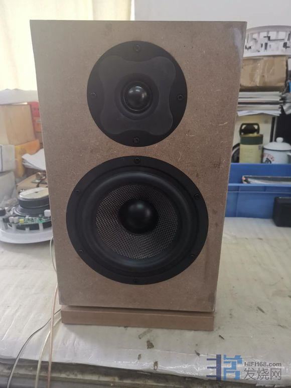 不过,首版木振膜的箱分频点1.5k,高音单元的感觉余量不太够,因此重新做了一版分频点在2k左右的分频器。比较的结果是2k左右的高音更好听。然后又做了一版分频点在2.5k的分频器,比较的结果是高音更好听。主要原因是高音单元的负担小了,失真也更小了。但这样6.5k寸低音在中频上的缺点就暴露了(第一版的木振膜的频响在1-2k间有一个比较大的凹陷,并且2.5k有一个较大的峰值)。经过设计优化改为凸起的防尘帽,改善了1-2k的频响,峰值也因此移至3k。为了改善中频响应,NS17的低音单元振膜外面涂了一层进口阻尼胶(和ATC类似的做法)。优化低频单元做了两版,历时2个月左右,大约2019年5-6月完成: