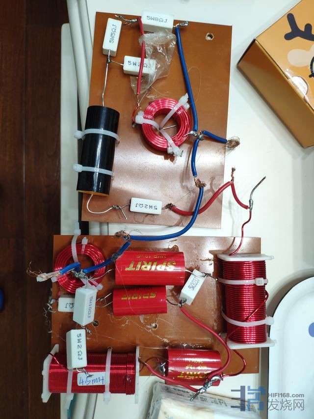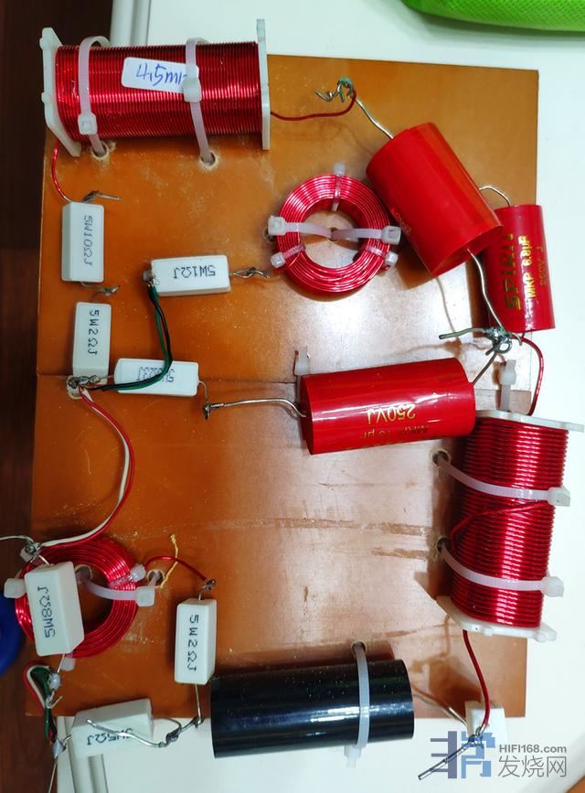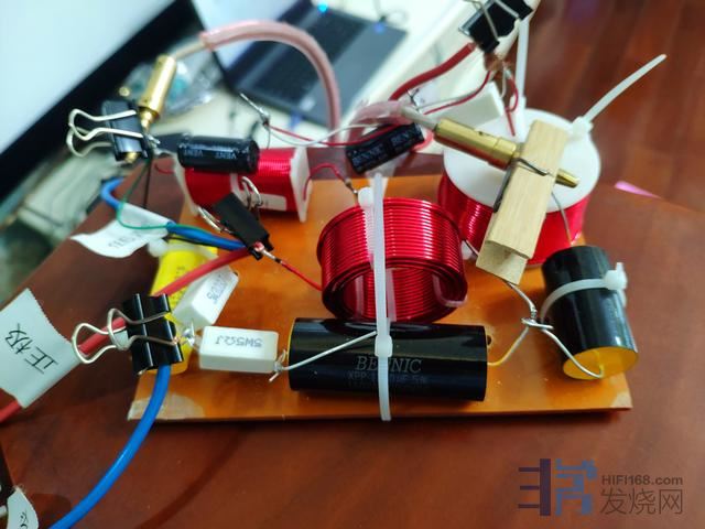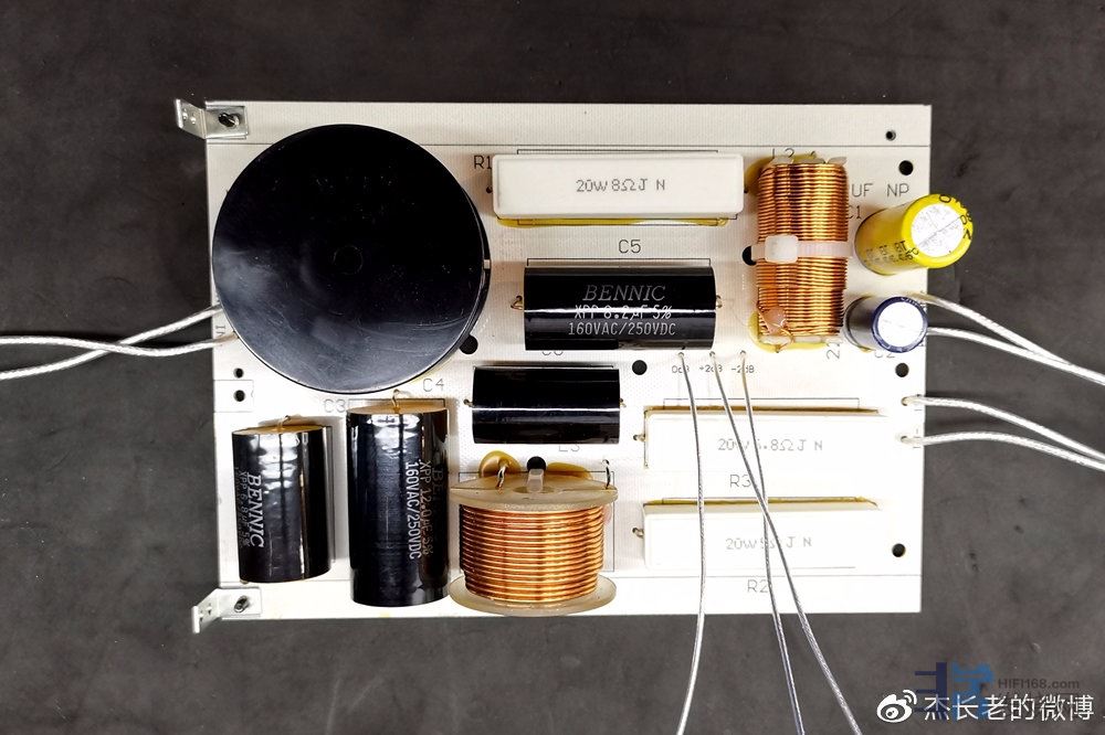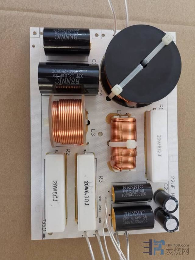 最终的分频器,低音分频器采用了著名的发烧品牌Bennic的最高级别B03级,旁路B04级无极性分频电容。高频采用Bennic XPP级分频电容。电感为电感厂手绕电感,电阻为20W无感水泥电阻。