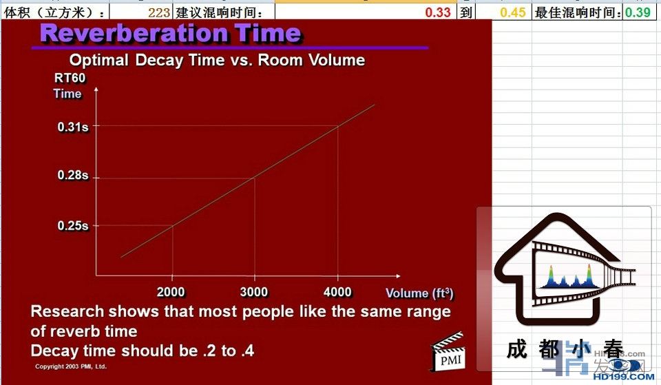 THX和HAA认证所引用的PMI标准223立方米混响时间范围为0.33秒到0.45秒,最佳值为0.39秒;